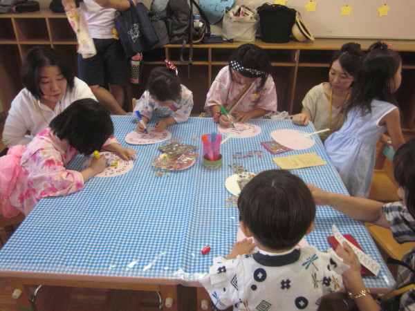 園内では、駄菓子屋さんコーナーにシューティングゲームコーナー、うちわデコレーションコーナーがあり、受付でもらったうちわに模様を描いたり、きらきらシールを貼ったりして、自分だけのオリジナルうちわを作りました。