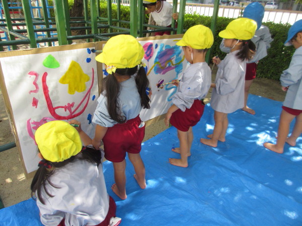 絵の具で自由に絵を描き、「これは飛行機だよ!」「じゃあ…その横にロケット!」と