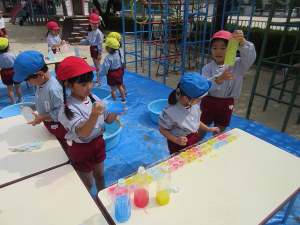 色水あそびでは、ペットボトルで色水を作ってから、卵パックやプリンカップに移し替えてジュース屋さんを開く姿があったり、いろんな色を混ぜ合わせて何色が出来るか実験したりする姿がみられました!!