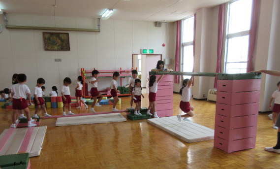 遊戯室では、子どもたちお気に入りのままごとやカラー積み木、ブロック、巧技台はもちろんなのですが、今回は特別に巧技台を高く重ねて、はしごをかけると…雲梯に大変身!外の雲梯とは違って足がつくため、年長、年中の子どもたちは足をあげて、年少の子どもたちは安心した様子で何回も挑戦していました。