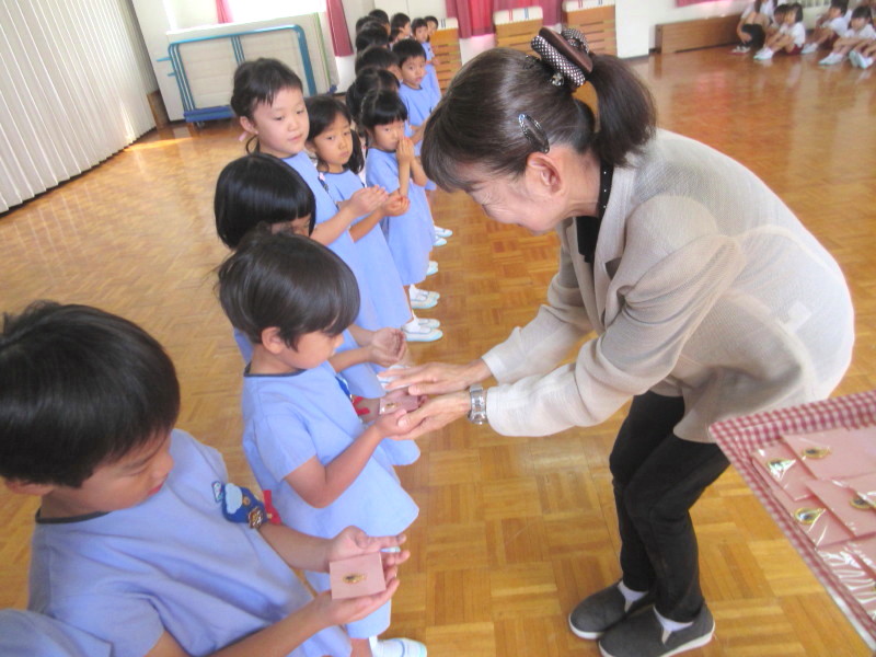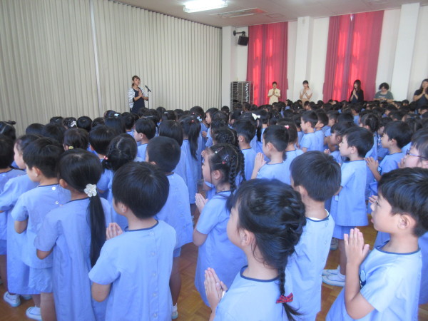 園長先生から、「2学期はたくさんの行事を通して、身体だけでなく、心も大きく成長してください。また、大きな災害があったときでも自分で自分の身を守れるように先生やお家の人とたくさんお話をしましょう。」と防災の日にちなんだお話を頂きました。