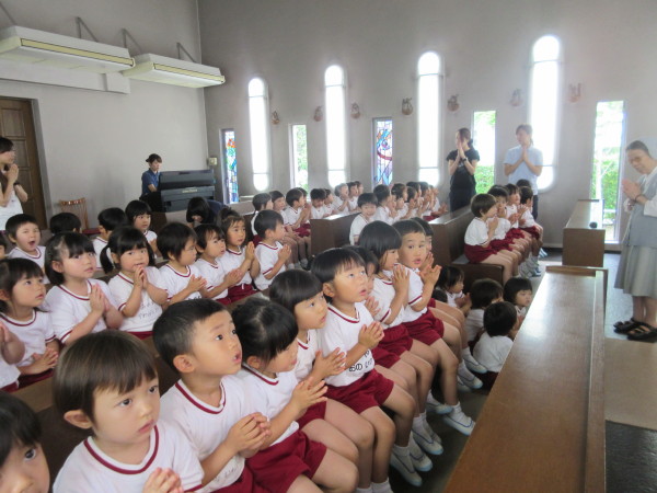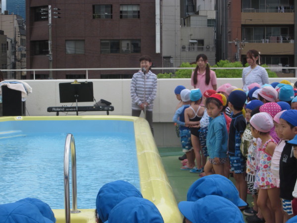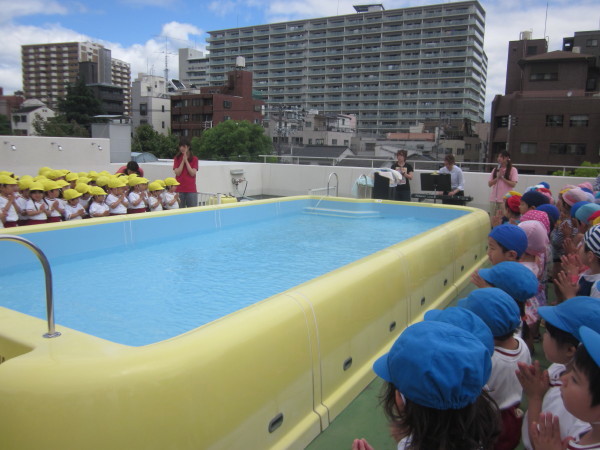 幼稚園の子どもたちが屋上のプールに集まり、プール遊びを安全に、楽しく過ごすことができるように、神様に心を込めてお祈りをしました。