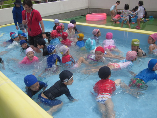 雨が続いていましたが、とってもいいお天気に恵まれ、年中組プール初日でした(^○^)♪