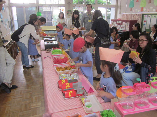 あやめ組とすみれ組では、「いらっしゃいませ〜」と元気いっぱいハンバーガーを作る姿が見られました。