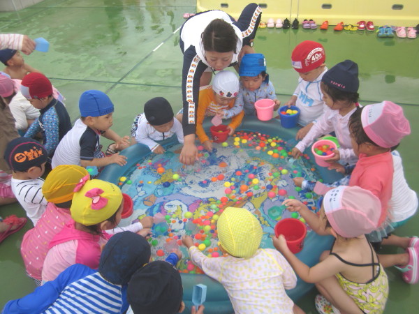今日は、大きいプールとビニールプールを年長組みんなでローテーションしながら遊びました。