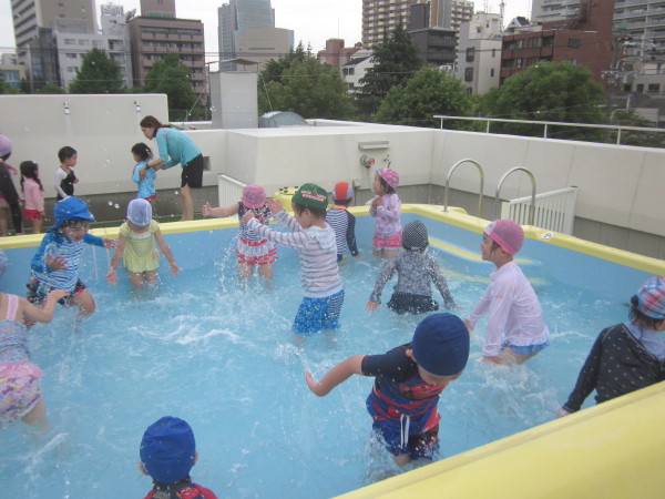 大きいプールでは、自分のお腹や背中、そして顔に水を掛け、水の中を散歩したり、水の掛け合いっこをして遊びました!