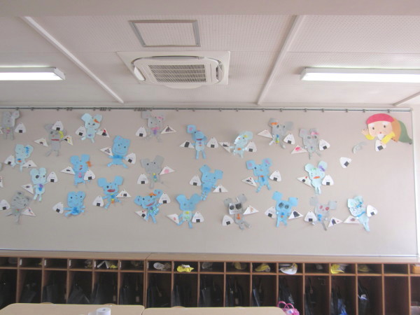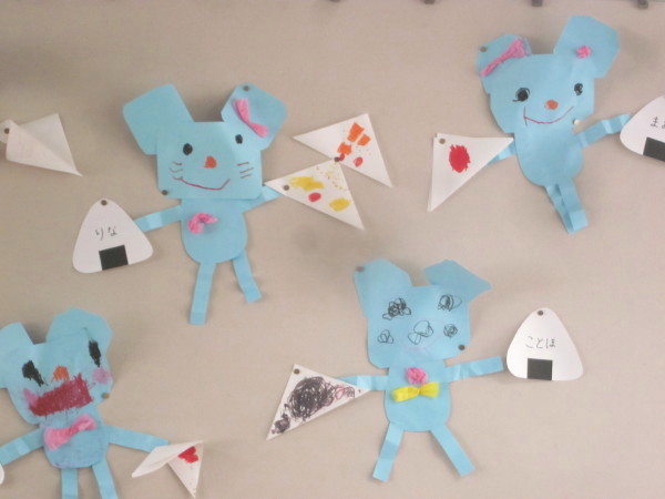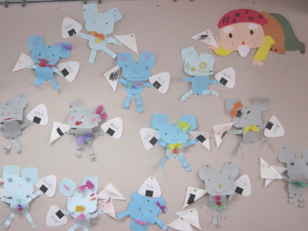 ねずみは、はさみとのりとクレパスを使って作り、花紙で飾り付けをしました!!