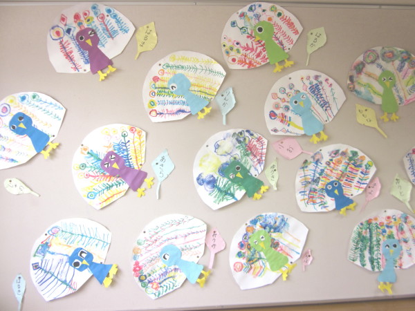 羽の模様を半紙に描き、水のついた筆でなぞると滲んで広がり、綺麗な羽が完成しました(^^♪