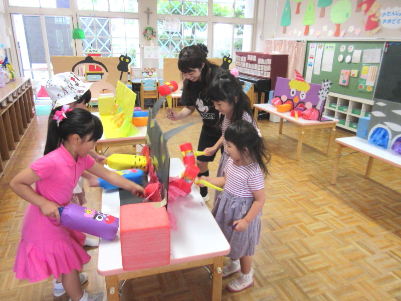 鬼たいじでは、ちょこちょこ顔をだす鬼を「えいっ!」とピコピコハンマーを力いっぱい振り下ろしていた子どもたち!!