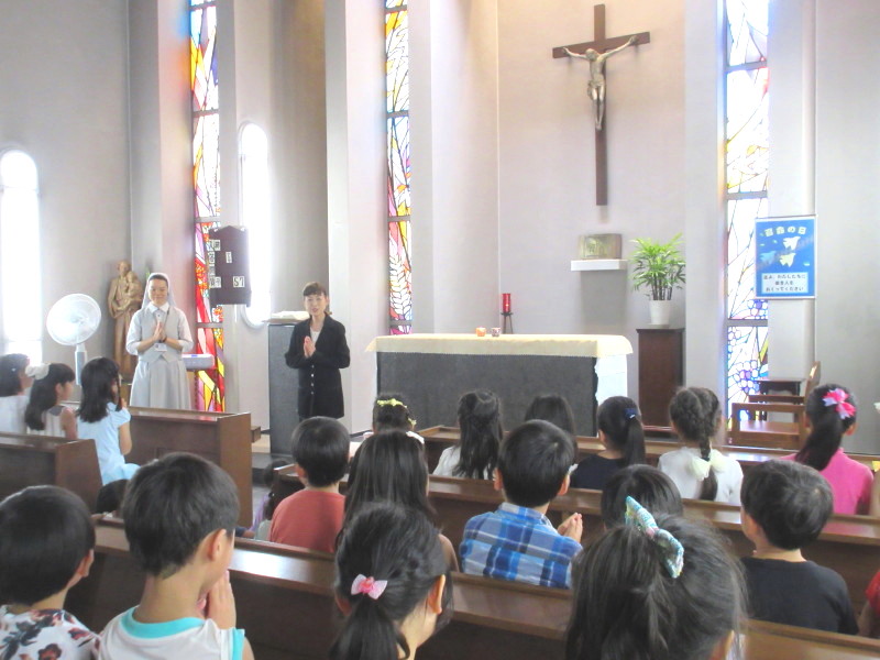おみどうに入ると、初めて感じる雰囲気に緊張感が増す子どもたちでしたが、まずはじめに、綺麗な声で聖歌を神様にお捧げしました。