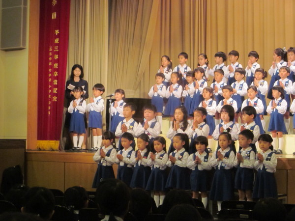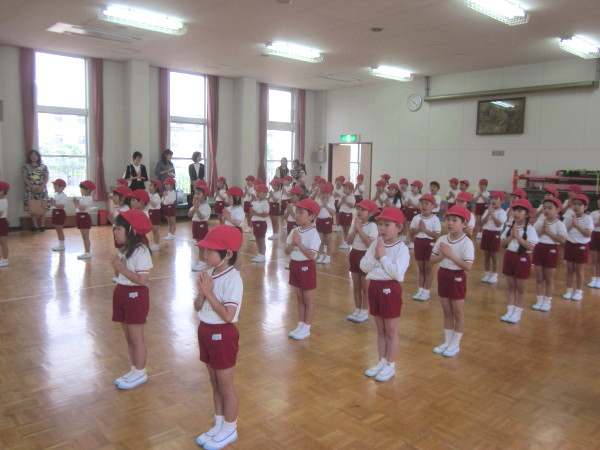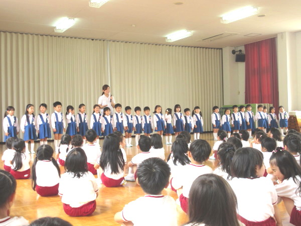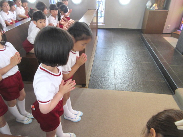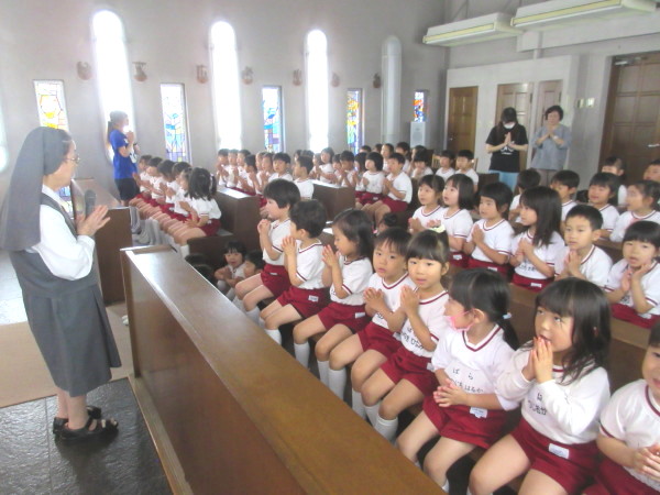 まずはじめに、みんなで聖歌「あの空はどうして青い」を歌って、今日も楽しく過ごせるようにお祈りをしました。