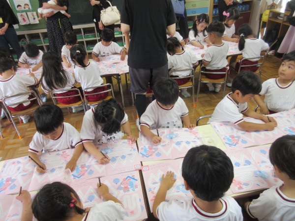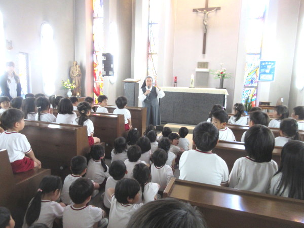 そして、聖母祭にむけて取り組んでいる「徳の花」のことに触れ、「周りの人に“ありがとう” “だいすきだよ”と言えたらいいですね。みんなと優しい心で過ごしましょう。」と、お話をいただきました!