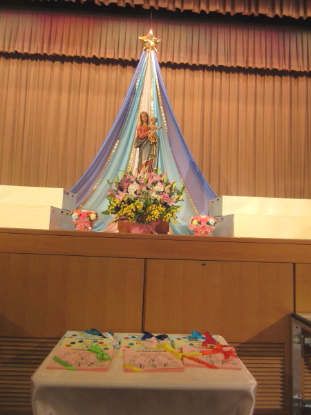 今日の日を迎えるために、子どもたち一人ずつが自分の「徳の花」を準備すると共に、子どもたちみんながいつでも「徳の花」を思いながら、一日一日を大切に過ごす事が出来るように、中央ホールにマリア様を飾り準備をしてきました。