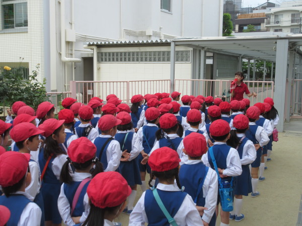 先生の話を聞きながら、グラウンドに避難して行きます。
