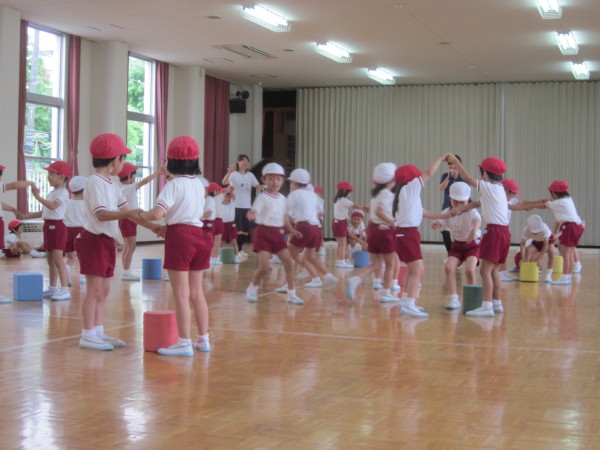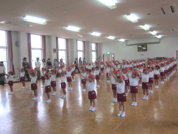 合同朝礼が終わったら、この後のゲームに備えて「キッズ体操」で体をしっかり動かして準備運動をします!