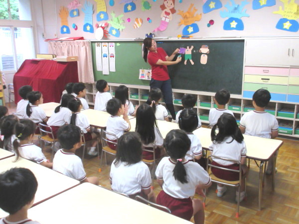 年中組の園開放最終日では、英語・ワーク・絵本『こどものせかい』を行いました。