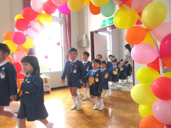 バルーンのアーチを、年長組と手を繋いでくぐって入場です!