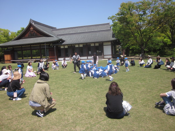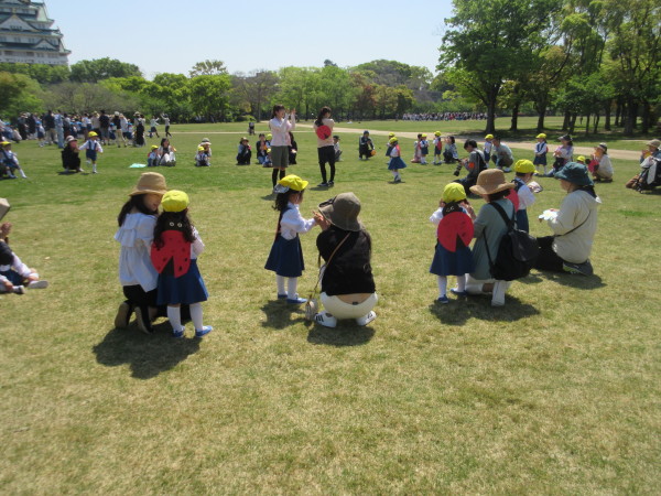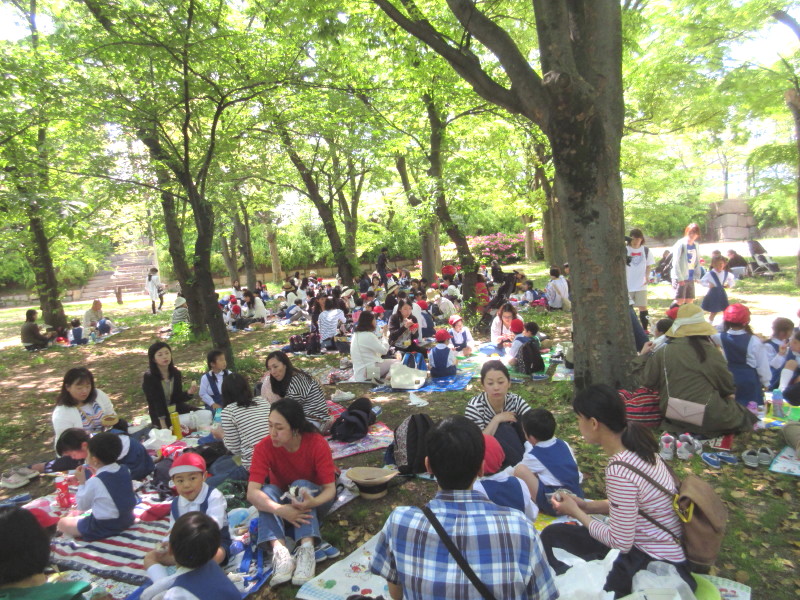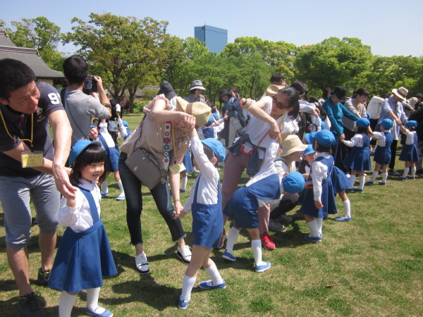 年少組は、西の丸庭園前に集合、年長組、年中組はお家の人と一緒に幼稚園を出発しました。
