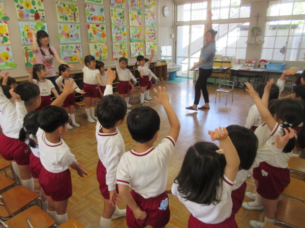 始めに、手遊び歌をしました。各クラスごとにお気に入りの歌があり、全部で8曲紹介し、その中から5曲、一緒に楽しみました!
