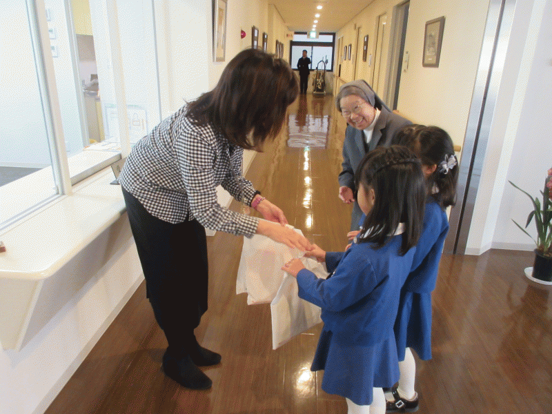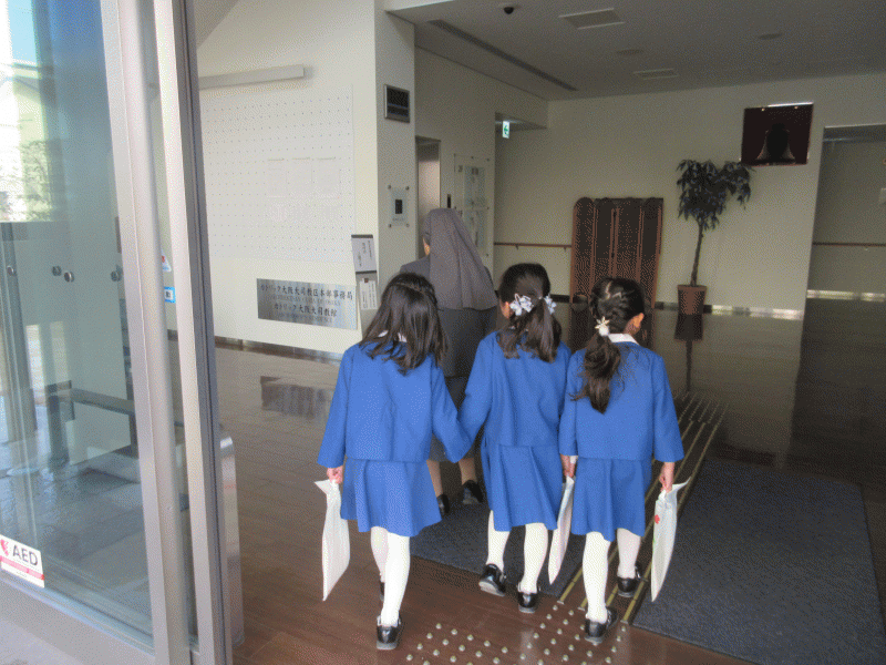 そして今日、子どもたちの温かい心がたくさん集まった献金を、助けを必要としている子どもたちと分かち合うため、年長組の代表の子どもたちが、お隣のカトリック大阪教区事務局に届けてきました。