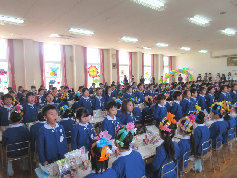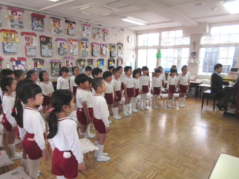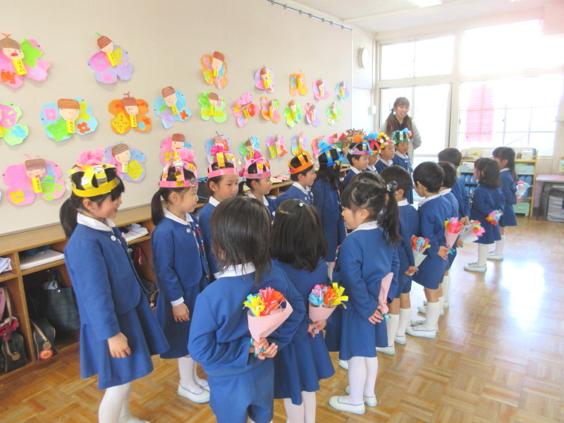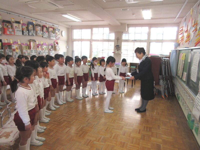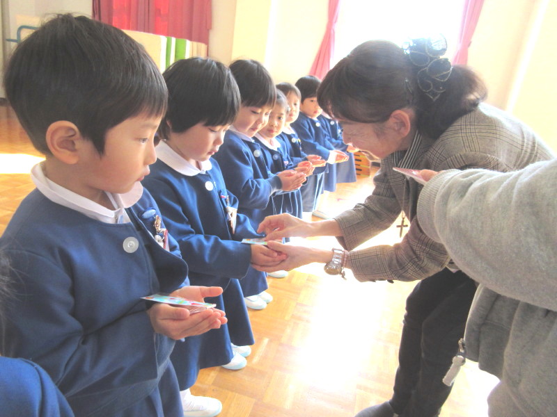 「3月は、暖かくなるのを待っていた木々や花が芽を出し、そして綺麗に咲き始める、そんな月です。また、お別れの季節でもあります。年長さんは、幼稚園や幼稚園のお友達とさようならをして小学校に行きますね。これからも、神様からのおめぐみを大切にして、素敵なお兄さん、お姉さんになってください。」というお話を頂きました!