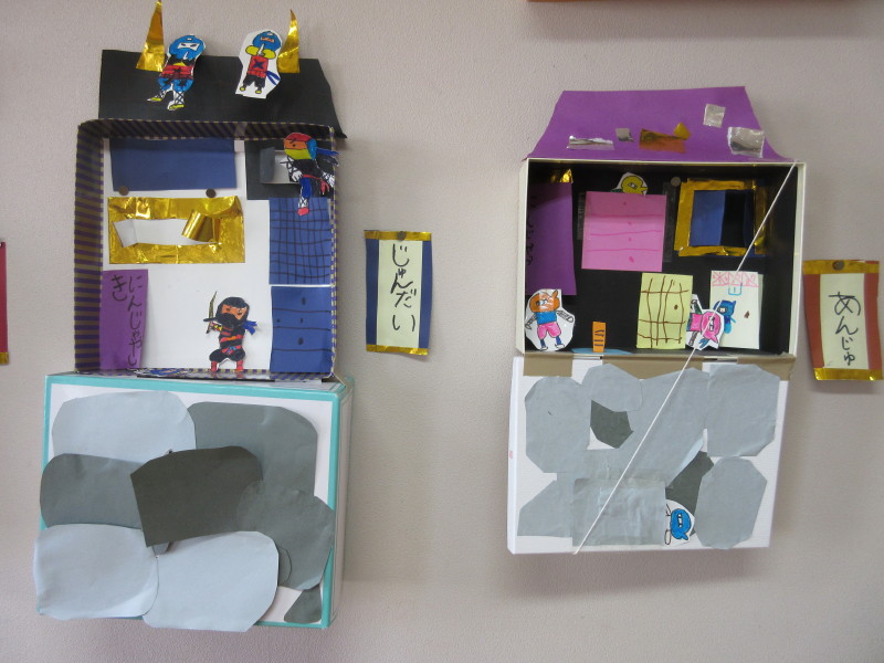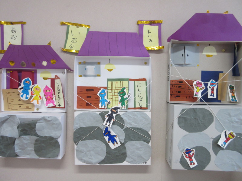 掛け軸やタンス、障子に隠れていたり、水の中に隠れている「水遁の術」の様子を表したり、子どもたちのアイデアあふれる作品となりました(^_-)-☆
