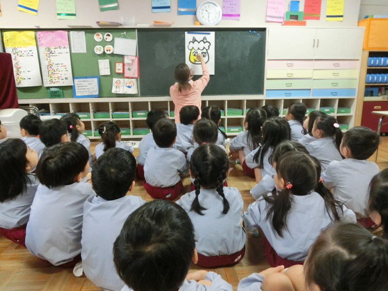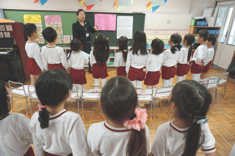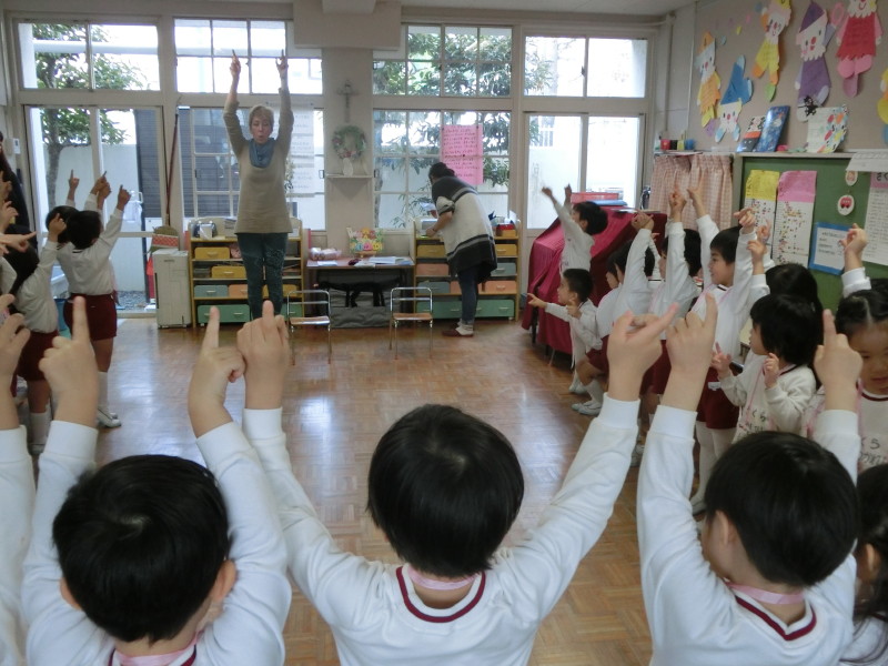 子どもたちは、先生のお手本をよく見て、手をグー・チョキと一生懸命動かします。