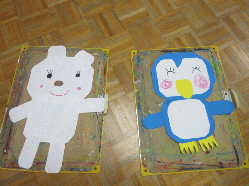 年少組2日目は、紙製作でペンギンとくまを作りました。