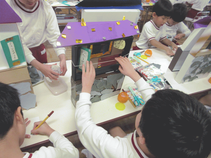 家から持ってきた空き箱を屋敷の土台にして、仕掛けのある屋敷を作ります!!