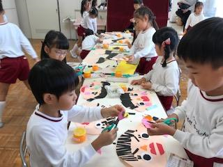 実際に作っていく時は、前に座っている友達と、顔の形や紙の長さ等を確認し合いながら取り組む姿もみられました。