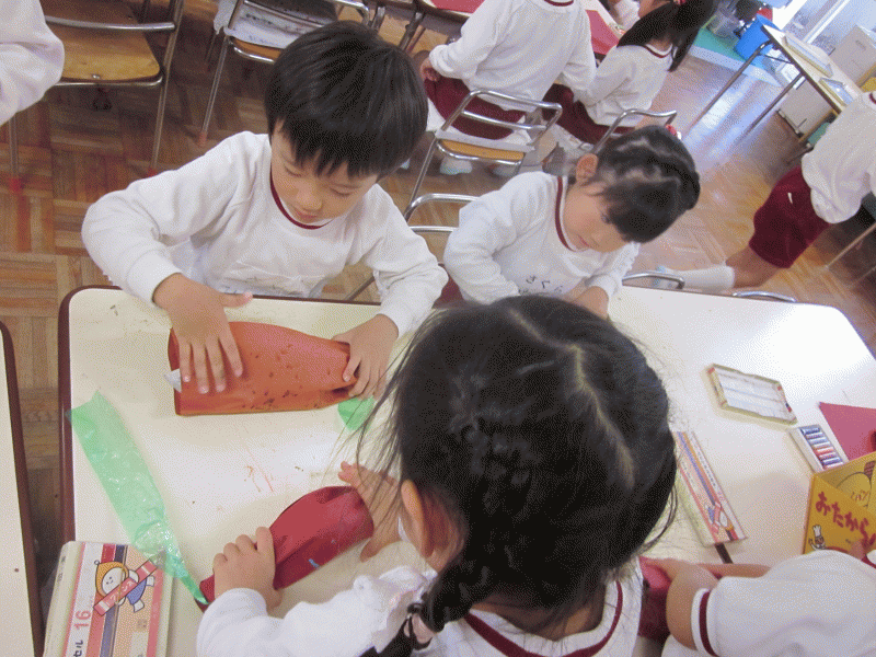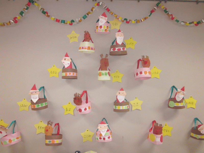 年中組は、紙製作でサンタクロース・トナカイの、