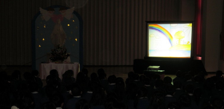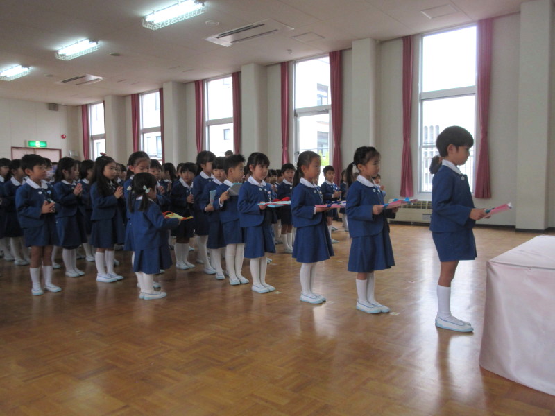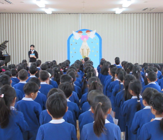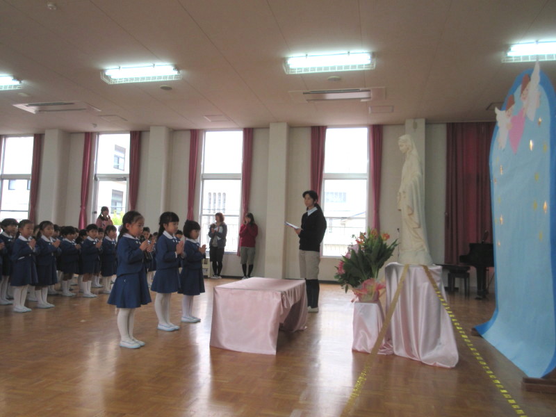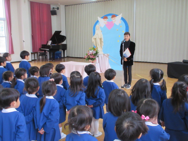 園長先生から、マリア様の優しさやマリア様のお母様のこと、今日まで子どもたちが行ってきた徳の花のこと、そして幼稚園のお誕生日であることのお話しをいただきました。