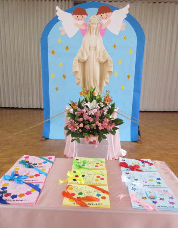 一人ひとりが善い行いを実行すると共に、その様子がみんなにわかるように、1階ホールにマリア様を飾り徳の花を咲かせて、準備をしてきました。