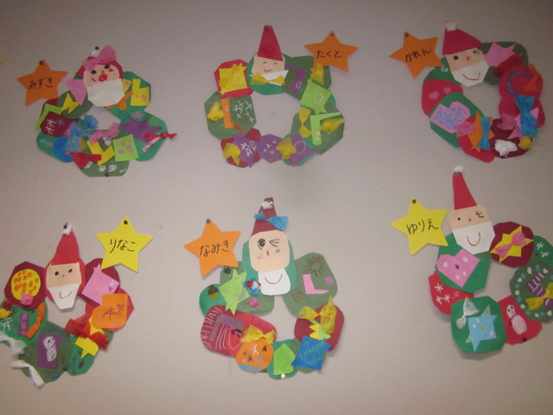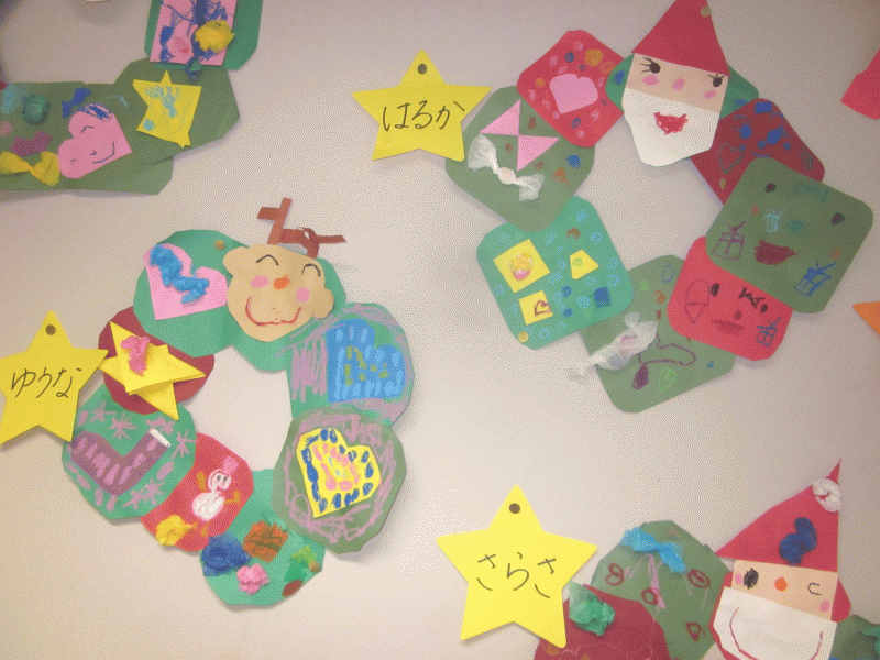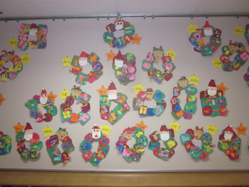 年少組の12月の壁面は、リースを作りました♪