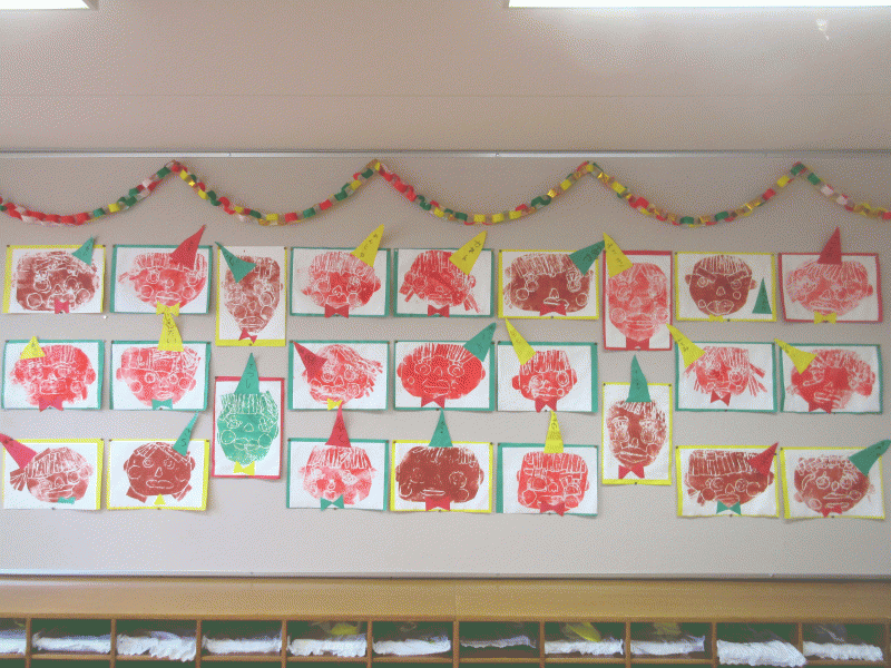 年長組の12月の壁面は、版画で『自画像』を作りました!
