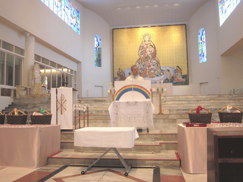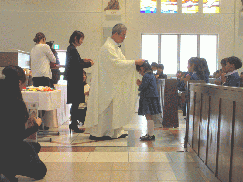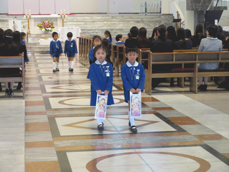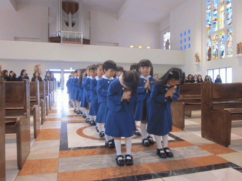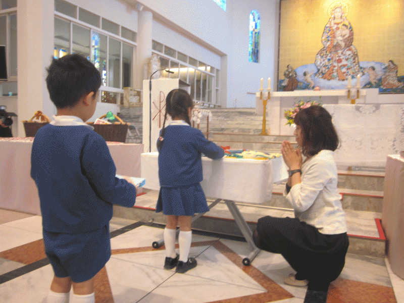 神様にご挨拶をして、席に座り、たくさんのお恵みを頂いて、大きくなったことに感謝の心をこめてお祈りをお捧げしました。