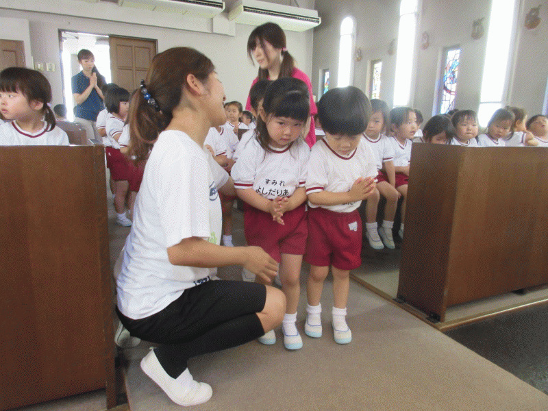 お部屋で、先生から「神様のお家に行くんだよ。」とお話を聞いて、どきどきしていた子どもたち。