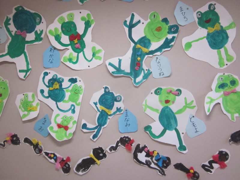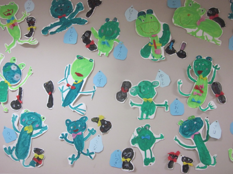 「かえるのうた」を歌いながら、伸び伸びと取り組む姿が見られ、画用紙に大きく描くことができました(^^)