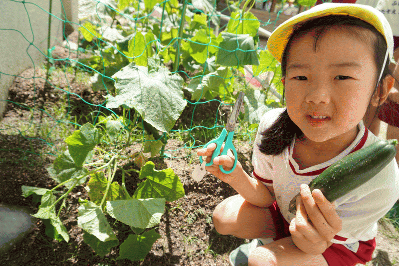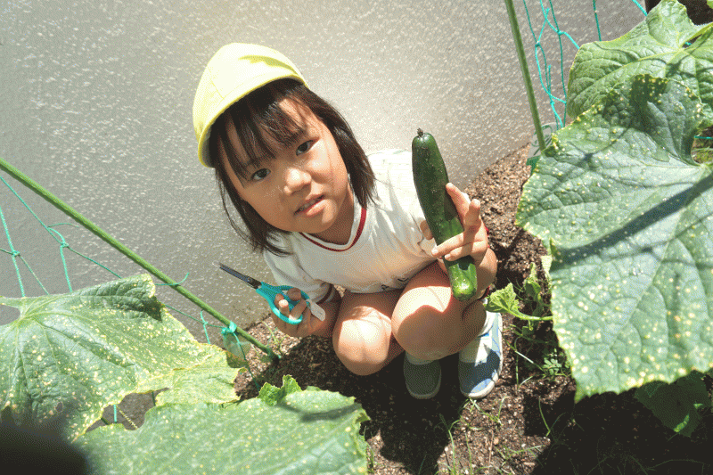 年長組で育ててきたきゅうりが、太陽をいっぱい浴びて大きくなり、