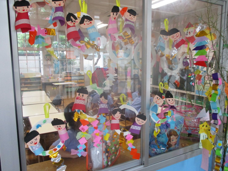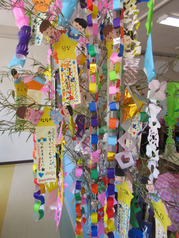 各クラスの前に笹を飾ると、子ども達は大喜びで織姫様と彦星様を作って飾り、