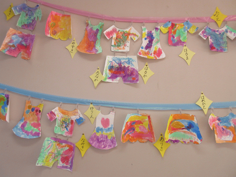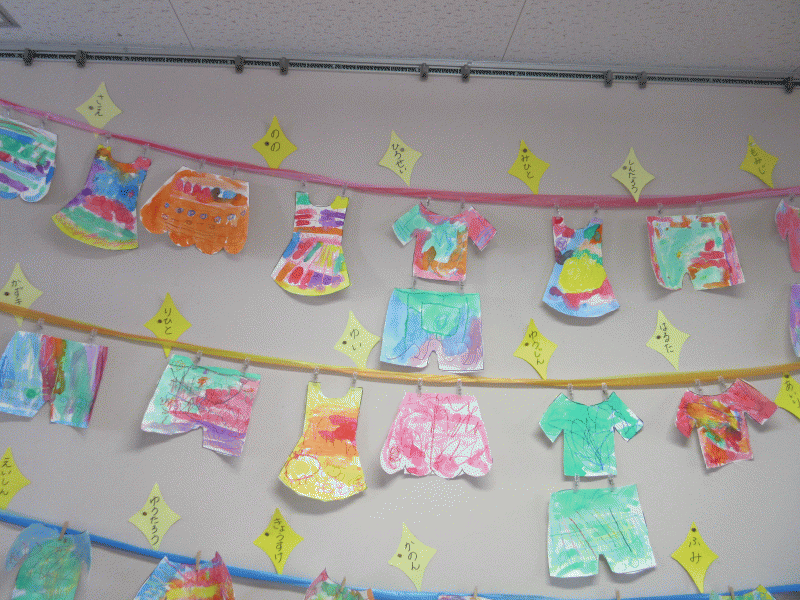 年少組の7月の壁面は、クレパスで模様を描いて、絵の具で色を染めた洗濯物です!