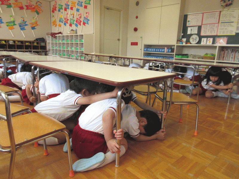 サイレン音が鳴り、すぐに机の下に潜って