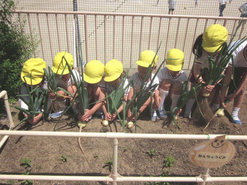 年中組の頃に植えた玉葱が、太陽をいっぱい浴びてどんどん大きくなり、