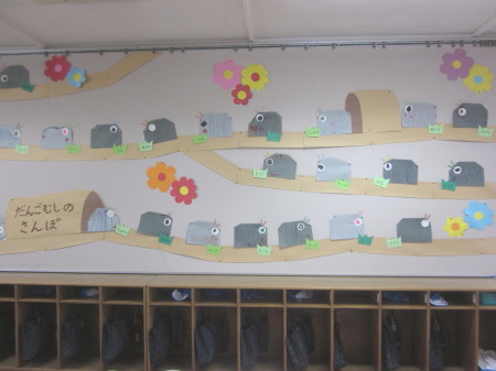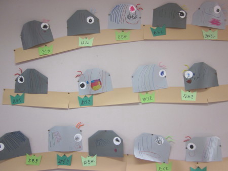 年少組の5月の壁面は、子どもたちが自由遊びでも身近に目にする生き物、