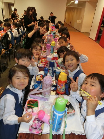 たくさん遊んだ後は、みんで集まってお昼ごはんを食べました。「私は、シャボン玉が楽しかった〜」「私はテレビに映ったよ!」などなど、今日楽しかったことを、友達としゃべりながら、わいわい食べていました(^^)