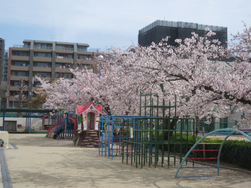柔らかな春の日差しの中、園庭の桜とチューリップが