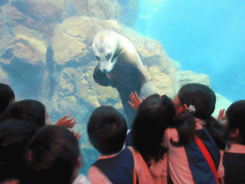 アザラシのコーナーでは、子ども達が行くとアザラシの方からスイ〜っと近寄ってきてくれ投げキッスの大サービス(^_-)-☆