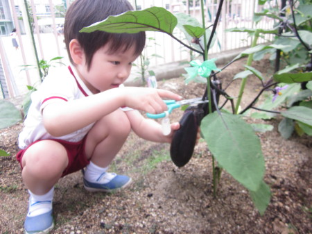 この日のお当番さんに収穫してもらったのですが、ナスの茎はとっても固かったようで一生懸命ハサミを動かしていました(^^)