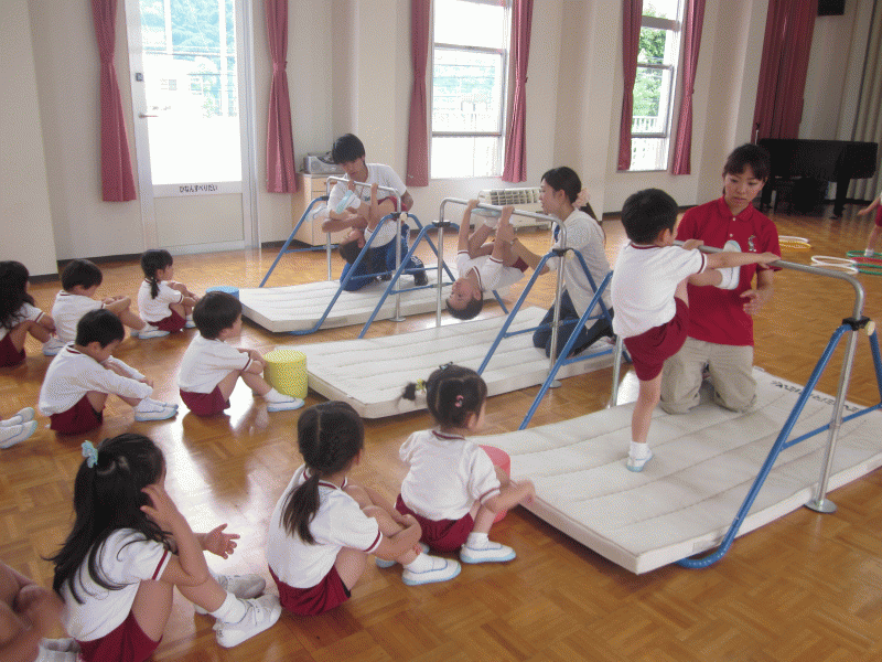 平均台や跳び箱、的あてなどに挑戦し