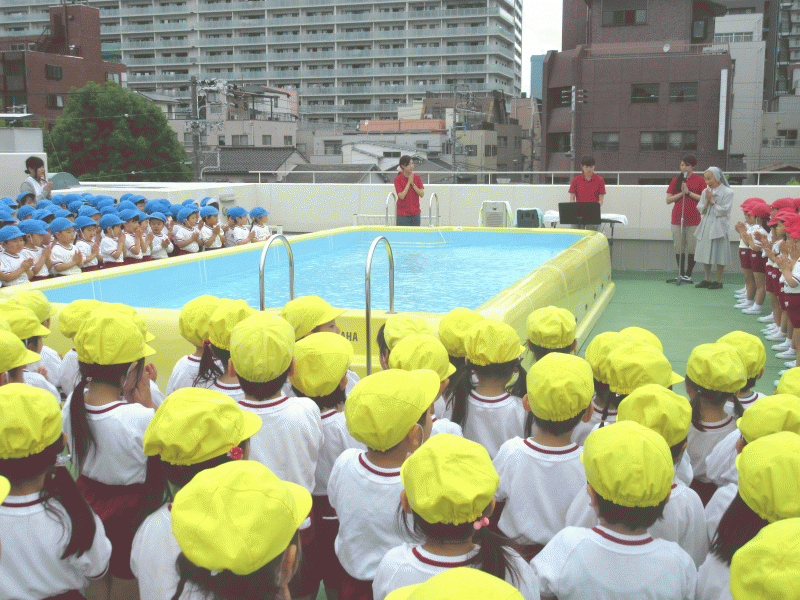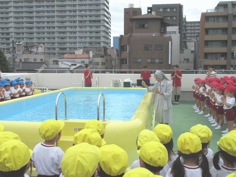 園長先生から「水は優しいけれども、時には怖いときもあります。」という話を頂き、神様から守っていただけるようにプールに聖水をまいて頂きました。